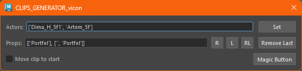 Инструмент CLIPS_GENERATOR_vicon предназначен для автоматизации процесса создания анимационных клипов в Autodesk Maya на основе данных Motion Capture (Vicon).