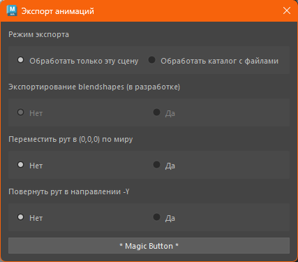 - Да - включает экспорт анимации blend shapes (требует доработки)